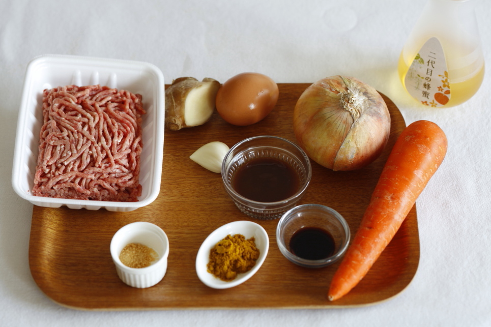 まずは、材料を用意しま~す。合いびき肉、玉ねぎ、にんじん、にんにく、しょうが、調味料などなど。「にんじんはイヤ~!」という方は入れなくてもOK。ほかにピーマンでも、コーンでもお好きなものを入れてくださいね。ただし、ぜひとも入れてほしいのが「二代目のはちみつ」。ひとさじ入れるだけで、コク&まろが断然変わります!