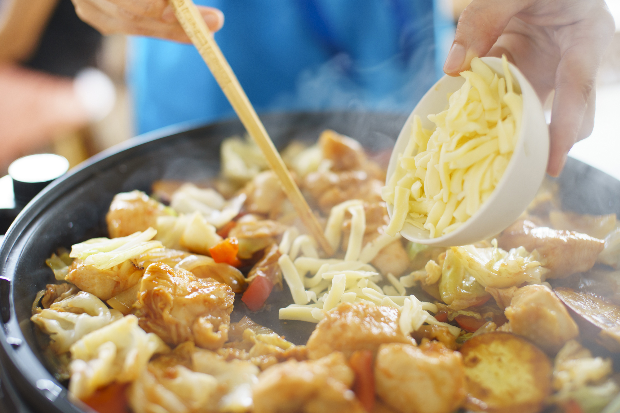5.中央をあけてとろけるチーズを入れ、ふたをして弱火で2~3分チーズが溶けるまで加熱する。チーズをからめながら、食べる。