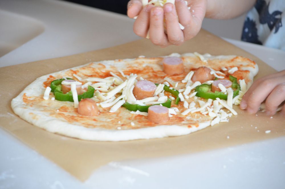 続いて、打ち粉をして生地をのばしていきます。ここで我が子の登場。粘土をこねるように生地をペタペタとのばし、絵を描くようにピザソースを塗って好きなソーセージや苦手なピーマンを並べていきます。どことなく、ワタクシの似顔絵にも見えてきますが、こういった遊びの要素を取り入れていくのが親子クッキングのミソだと思っています。