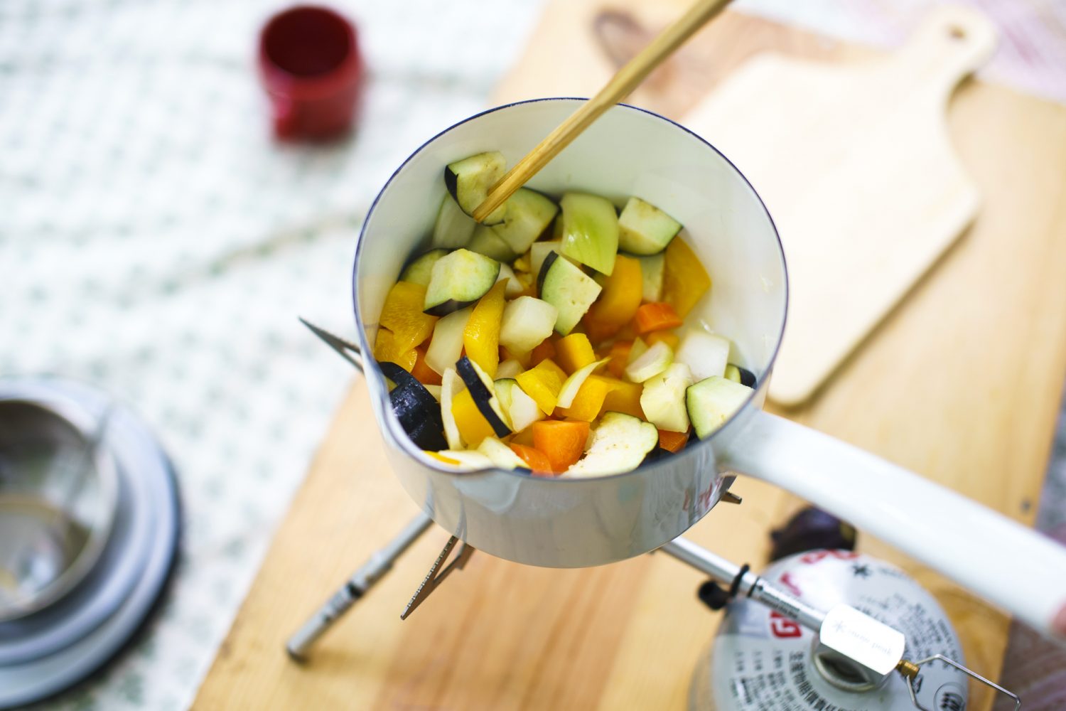 1.なす、にんじん、パプリカ、玉ねぎは小さめのひと口大に切る。