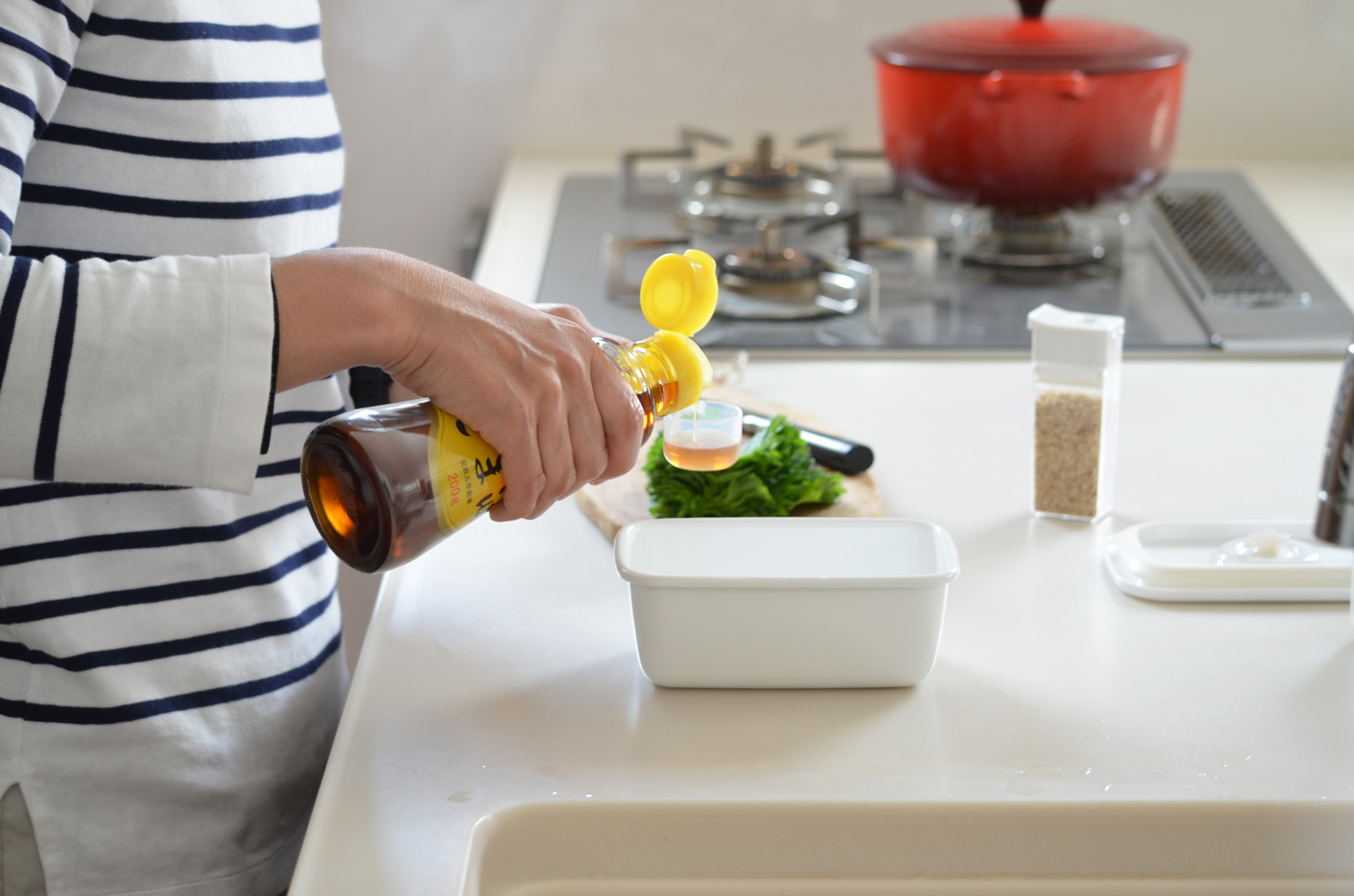 しょうゆ大さじ3、ごま油大さじ2、にんにくチューブ小さじ1、白ごま・二代目の蜂蜜少々を入れた保存容器に、大葉20枚を浸すだけ。塩分控えめな方はしょうゆを、油控えめな方はごま油を少し減らしていただくと良いかと思います。
