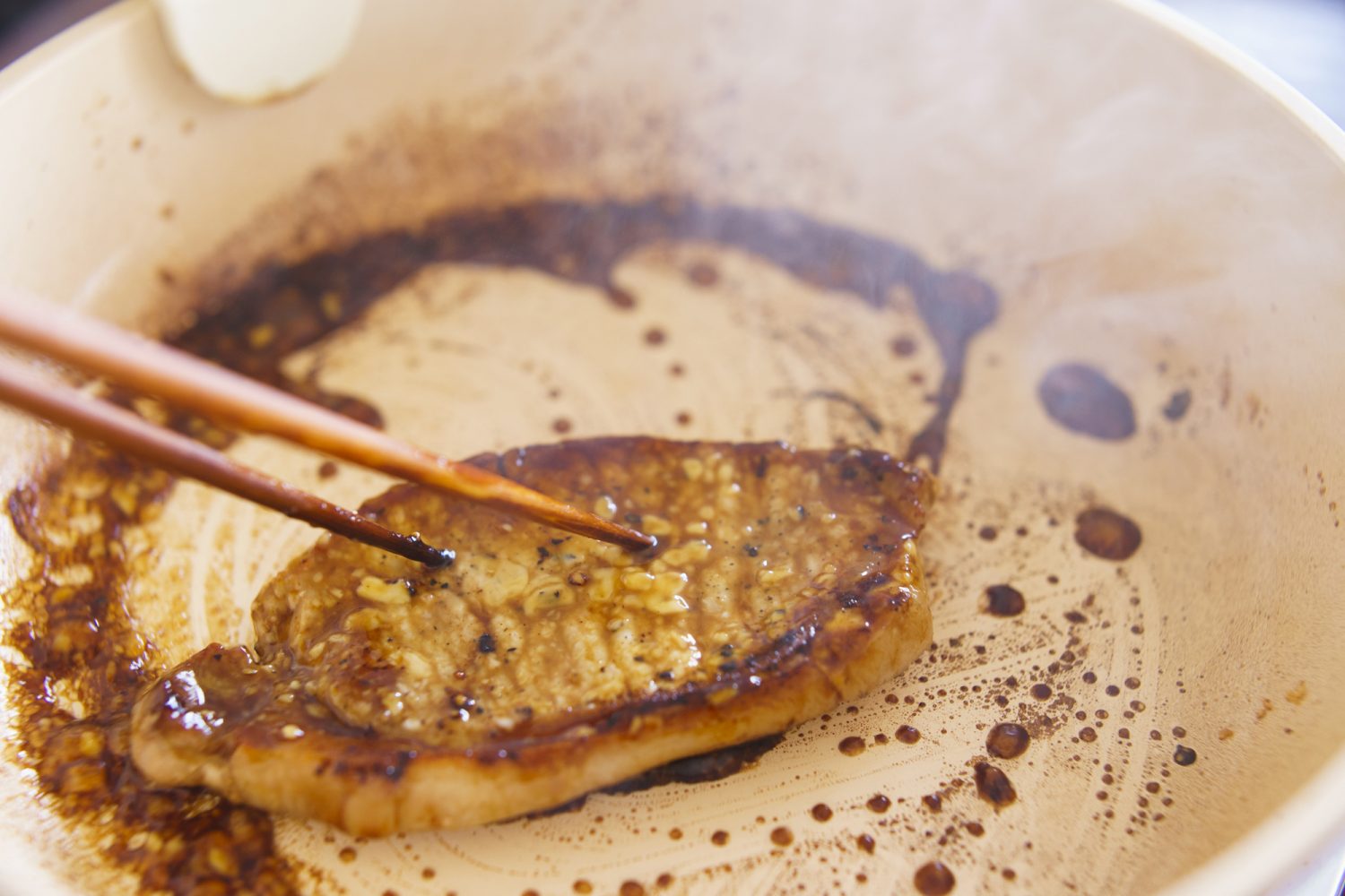 豚肉は両面3分くらいずつ焼き、こんがりしたらハニマヨソースを加えてからめれば完成!