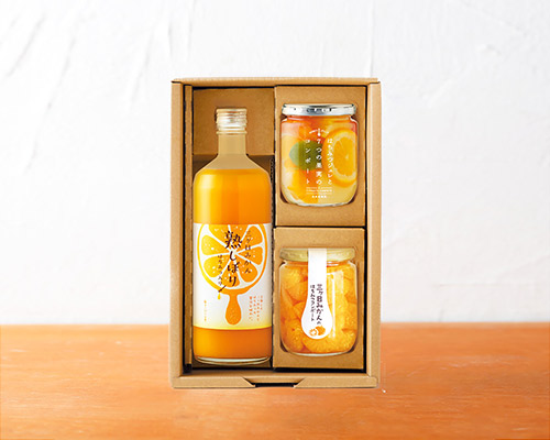 彩り鮮やかなはちみつジュレと7つの果実のコンポート、三ヶ日みかんがたっぷりの三ヶ日みかんのはちみつコンポート、まろやかな味わいのジュース、三ヶ日みかん熟しぼりのセットです。