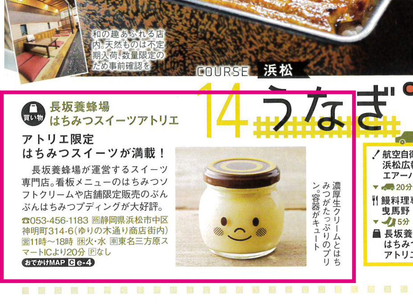 旅の情報誌としておなじみの『じゃらん 東海10月号』にて、「ごちそうドライブ」コーナーで、長坂養蜂場スイーツアトリエの「ぶんぶんのはちみつプディング」が紹介されました。