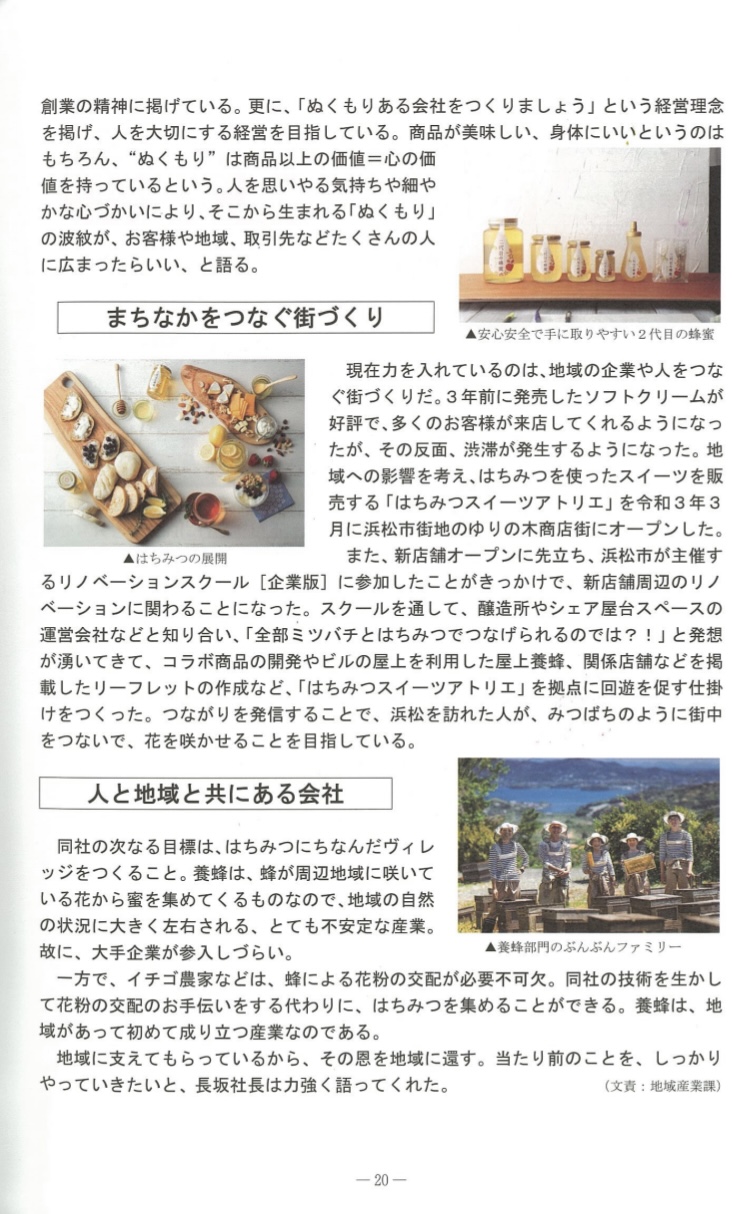 静岡県経済産業部商工業局「令和3年度 元気な企業実態調査報告書」にて長坂養蜂場を取り上げていただき、会社が大切にしていることやコロナ禍で行った浜松街中での取り組みについて紹介されました。