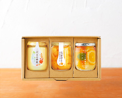 長坂養蜂場の看板蜂蜜はちみつ二代目の蜂蜜 300gをはじめ、三ヶ日みかんのはちみつコンポート、はちみつジュレと7つの果実のコンポートが入った、色鮮やかな3種のギフトです。