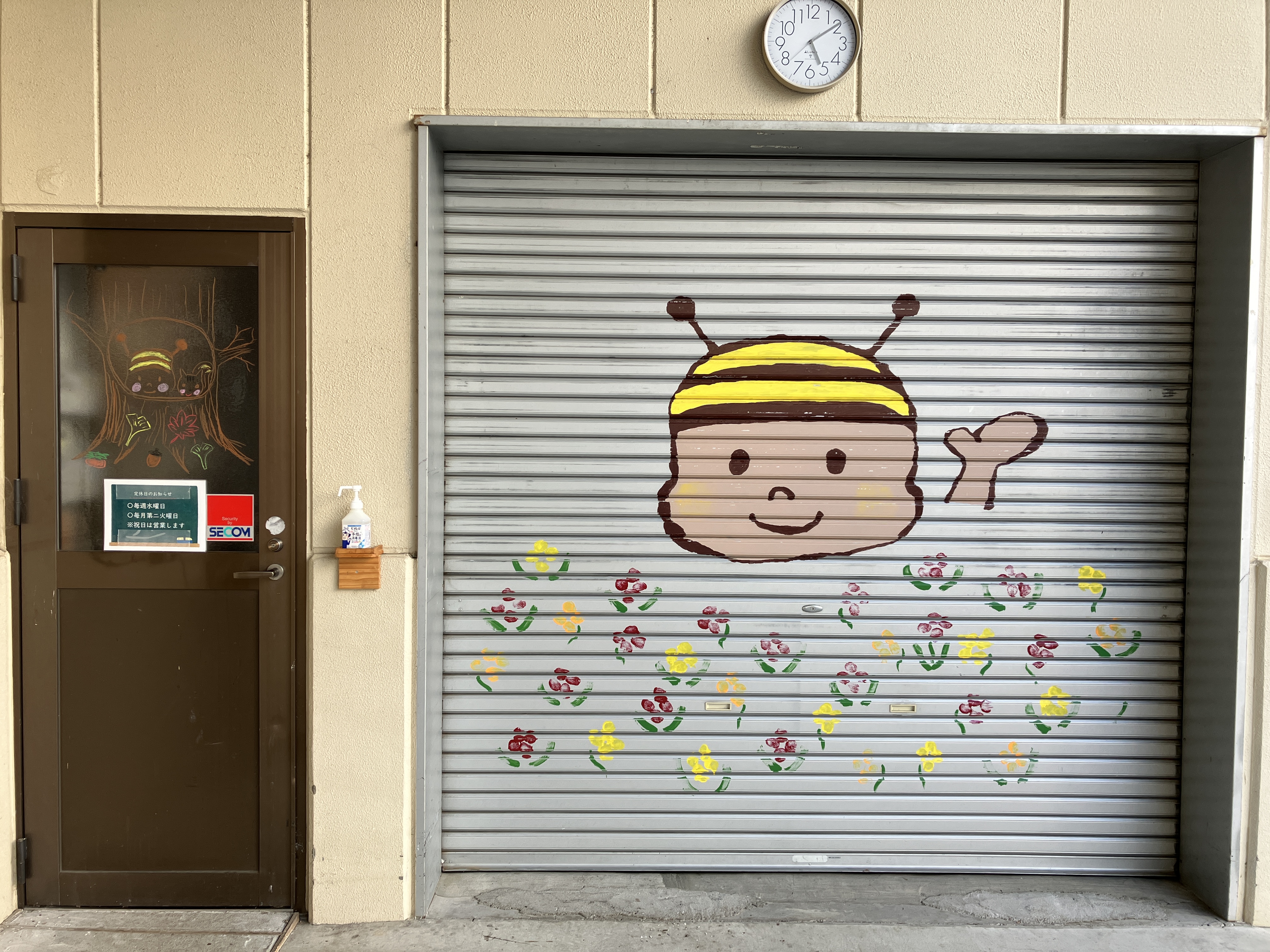 店舗裏の駐車場から正面玄関に向かって進んでいくと、シャッターに大きく描かれたぶんぶんが登場!! 隣のドアにも季節に合わせたイラストが描かれています♪
