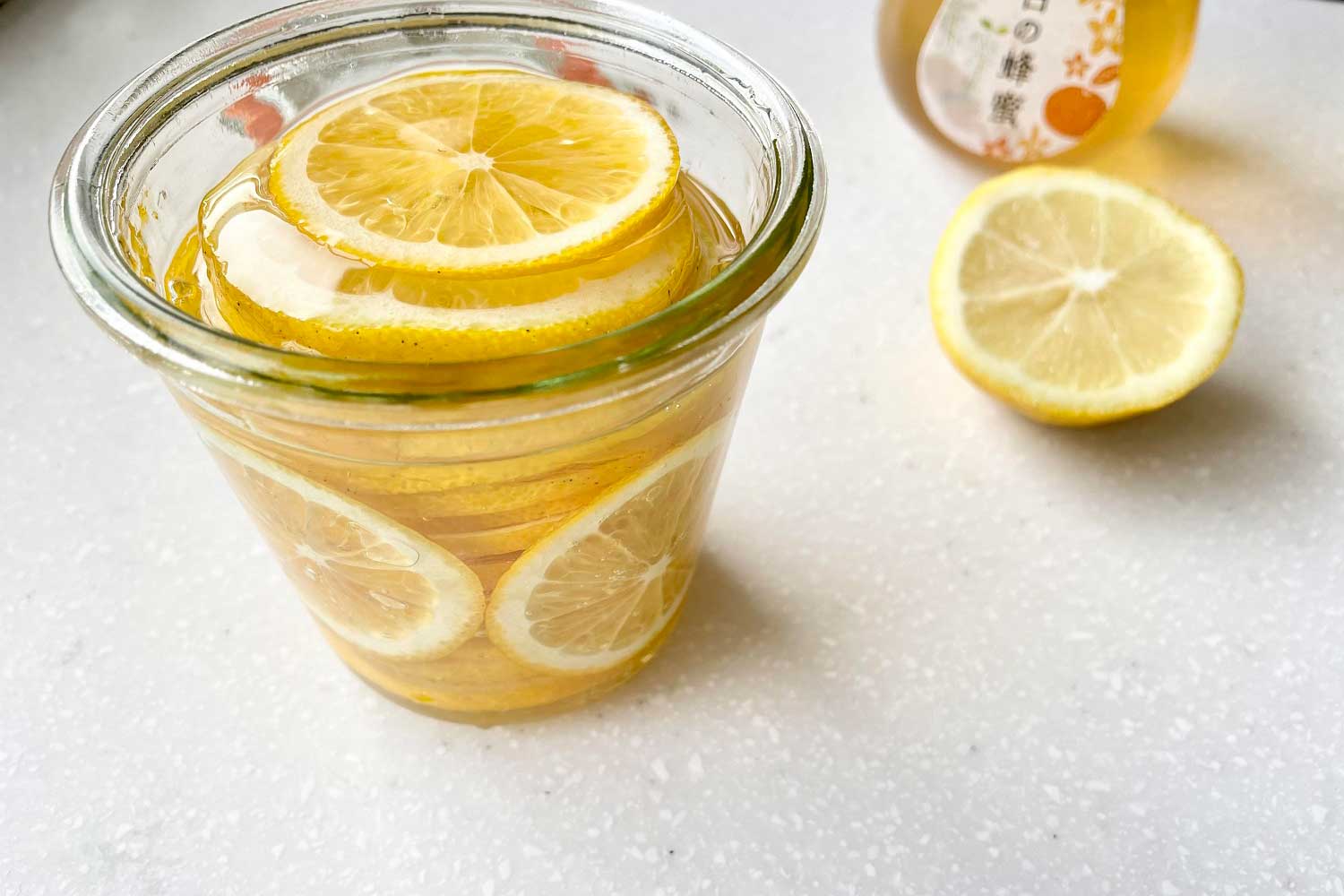 レモンを半分くらい入れてはちみつを加え、またレモン、はちみつの順に入れていくと満遍なくはちみつが浸透しやすいです。