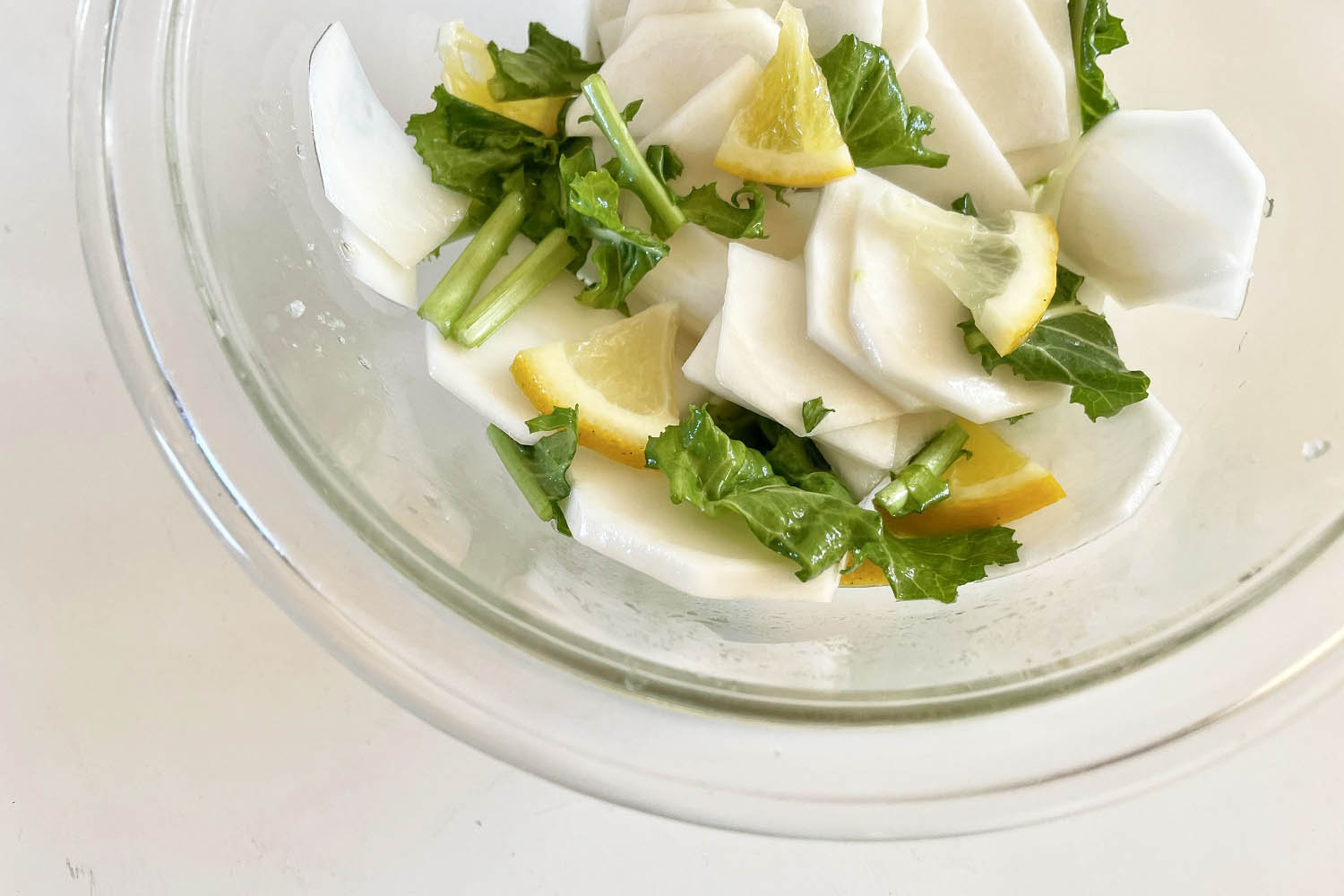 スライスして塩揉みしたかぶとかぶの葉に、はちみつレモン、オリーブオイル、白ワインビネガーを少々。