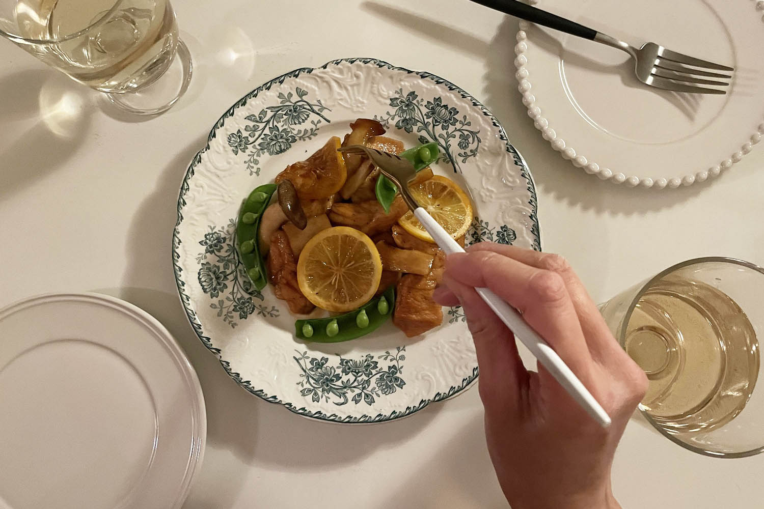 塩胡椒をした鶏肉(今回はムネ肉を使用)を両面こんがり焼き、エリンギも一緒に炒めます。白ワイン少々(料理酒でも可)と醤油、みりん少しで味付けをし、はちみつレモンをレモンごと加え、全体に良い色がつくまでソテーします。スナップエンドウは別に茹でて後から乗せました。夕ご飯の1品にも、ワインのおつまみにもぴったりです。