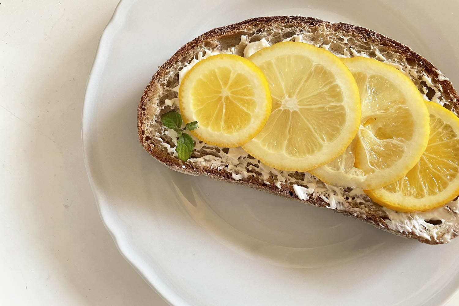 1つ目は、はちみつレモントースト。クリームチーズを塗ったパンにはちみつレモンを載せるだけ。とても簡単ですが、美味しいのでオススメです。食パンでももちろん大丈夫。軽くトースターで焼いても美味しく召し上がれます。