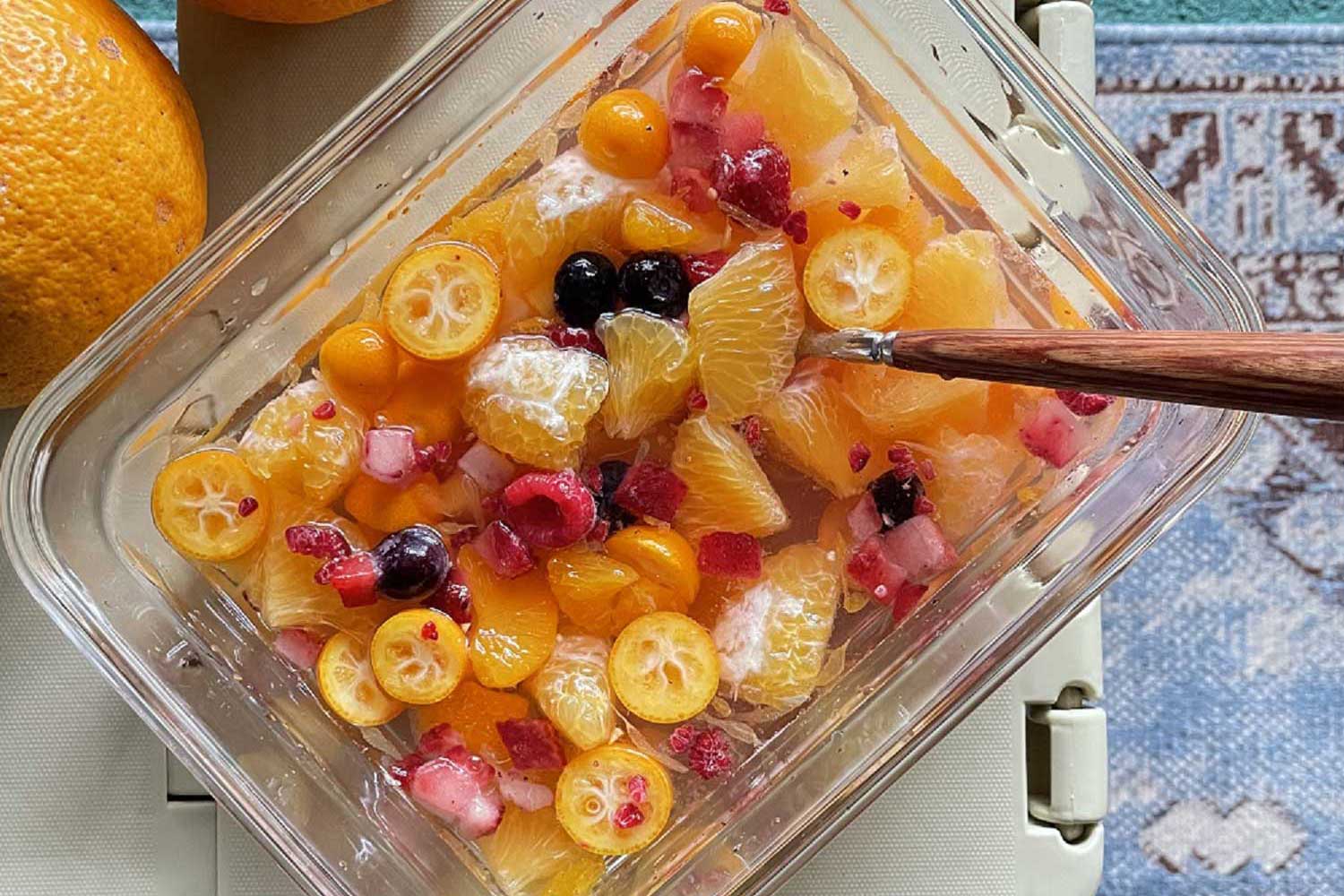 まずは、フルーツ缶の汁を少々、そこに無糖のソーダ水とはちみつを加えてしっかり混ぜます。フレッシュな柑橘類は丁寧に皮や種を除きます。下準備が済んだら、あとはフルーツ缶や冷凍ベリーと合わせて、シロップに加えて混ぜるだけ!