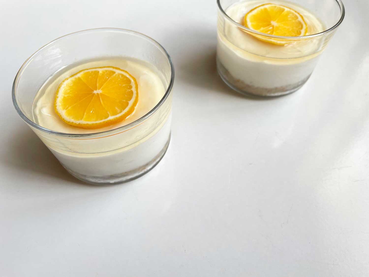 こちらは、市販の全粒粉のクラッカーを細かくしてバターと混ぜてボトムを作り、冷蔵庫で冷やします。その間に、水切りヨーグルト、クリームチーズ、はちみつでチーズクリームを作ります。冷蔵庫で冷やしているクラッカーが入っている容器の上にのせ、再び冷やします。最後にはちみつレモンシロップと漬けたレモンを乗せて出来上がり。