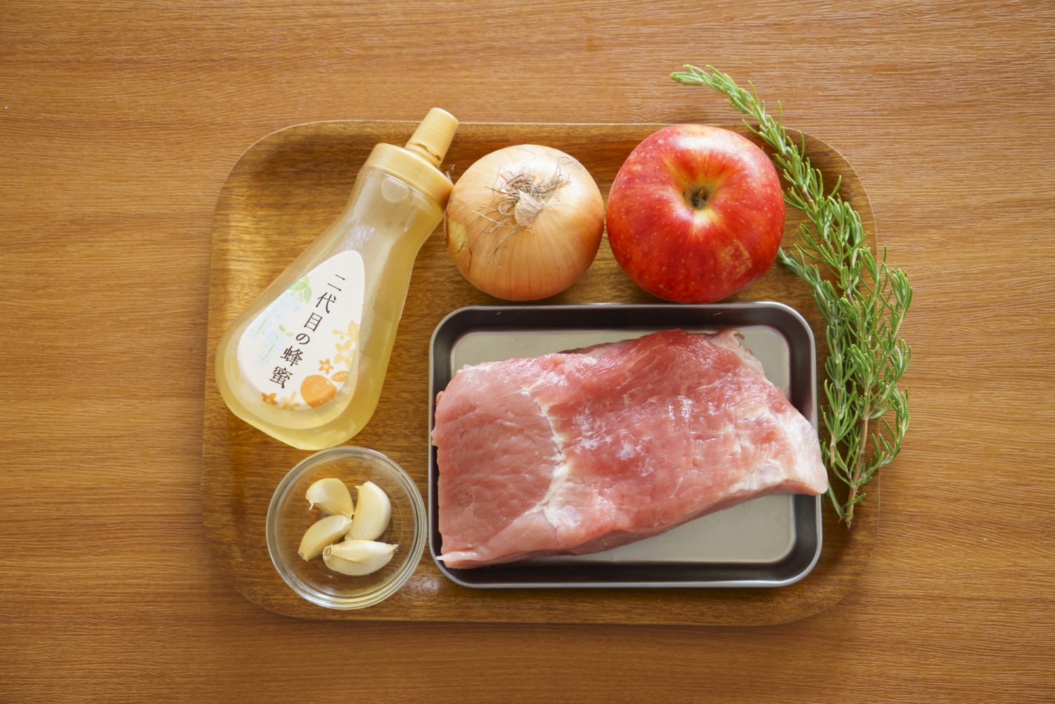 さて、材料はこちら! 豚肉とりんごと玉ねぎと二代目の蜂蜜と…。りんごは、お好みのもので大丈夫です。