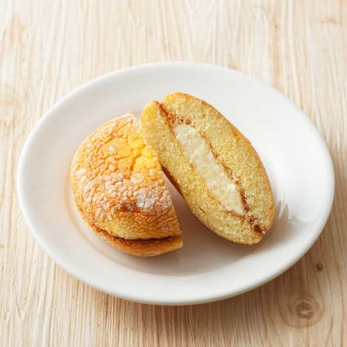 たこまんさんのふわっと柔らかいブッセ「大砂丘」の中に、朝霧高原牛乳さんのフレッシュなミルククリームとはちみつを入れました。