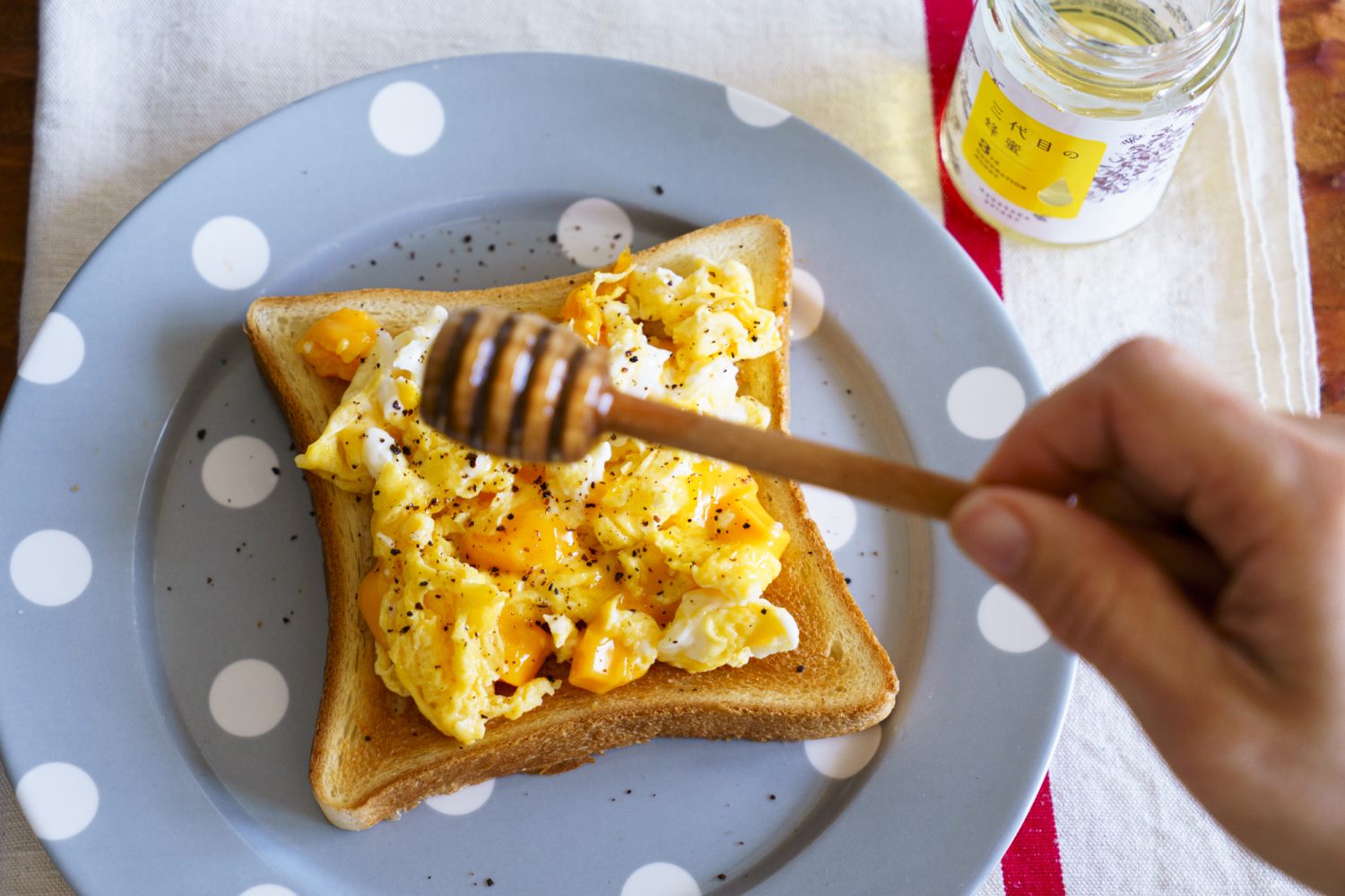 他にもはちみつトーストは無限にありますが、最近のお気に入りを4つご紹介。1つ目は、はちみつスクランブルエッグトースト。フライパンにバターを入れて弱火で溶かし、混ぜた材料Aを流しいれ半熟になるまで混ぜます。角々に切ったチーズ入りのスクランブルエッグをカリッと焼いたトーストにオン!
