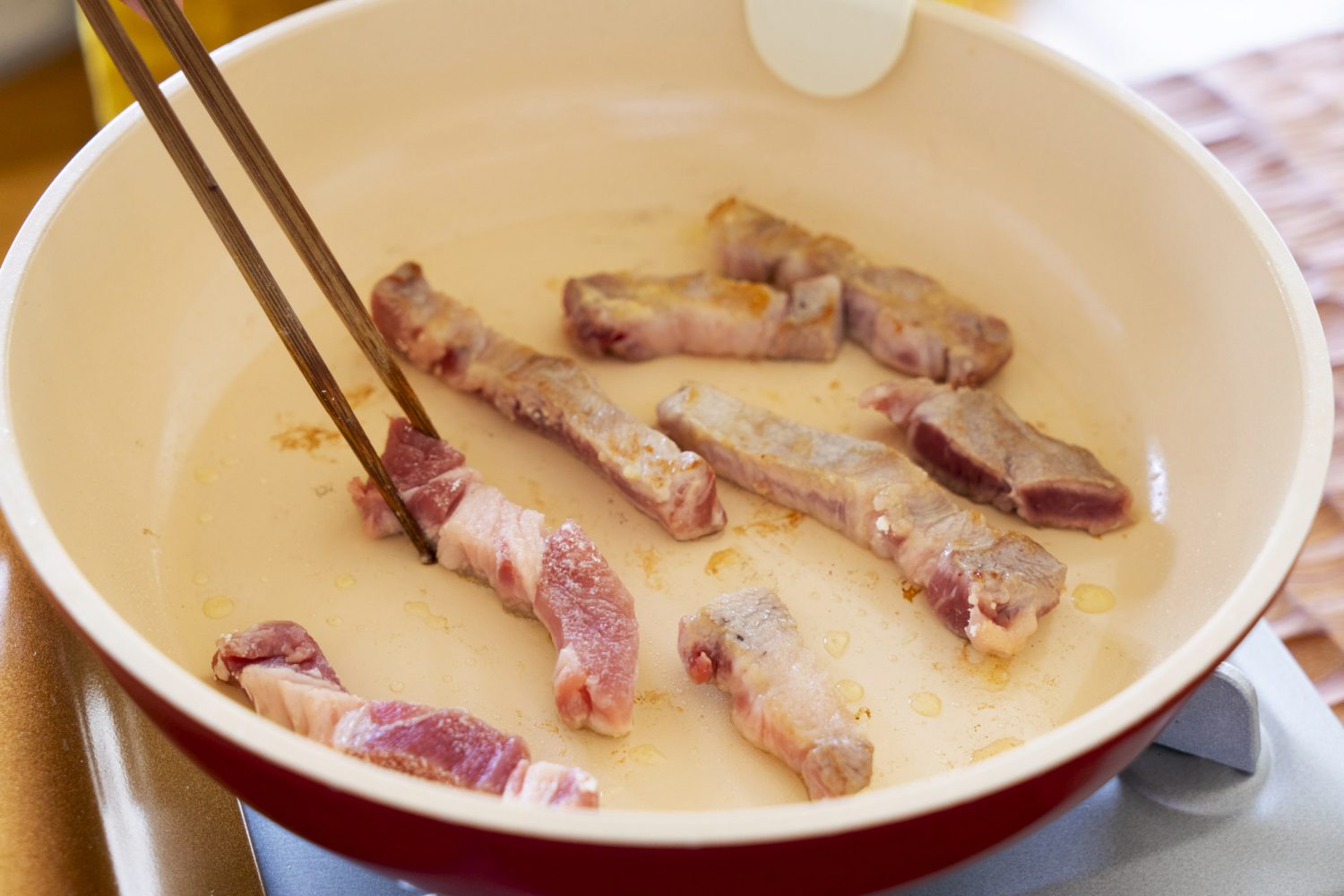 3.フライパンに油、さつまいもを入れて中火で熱し、こんがりとした焼き色をつけて取り出す。続けて豚肉を入れ、こんがりと焼く。