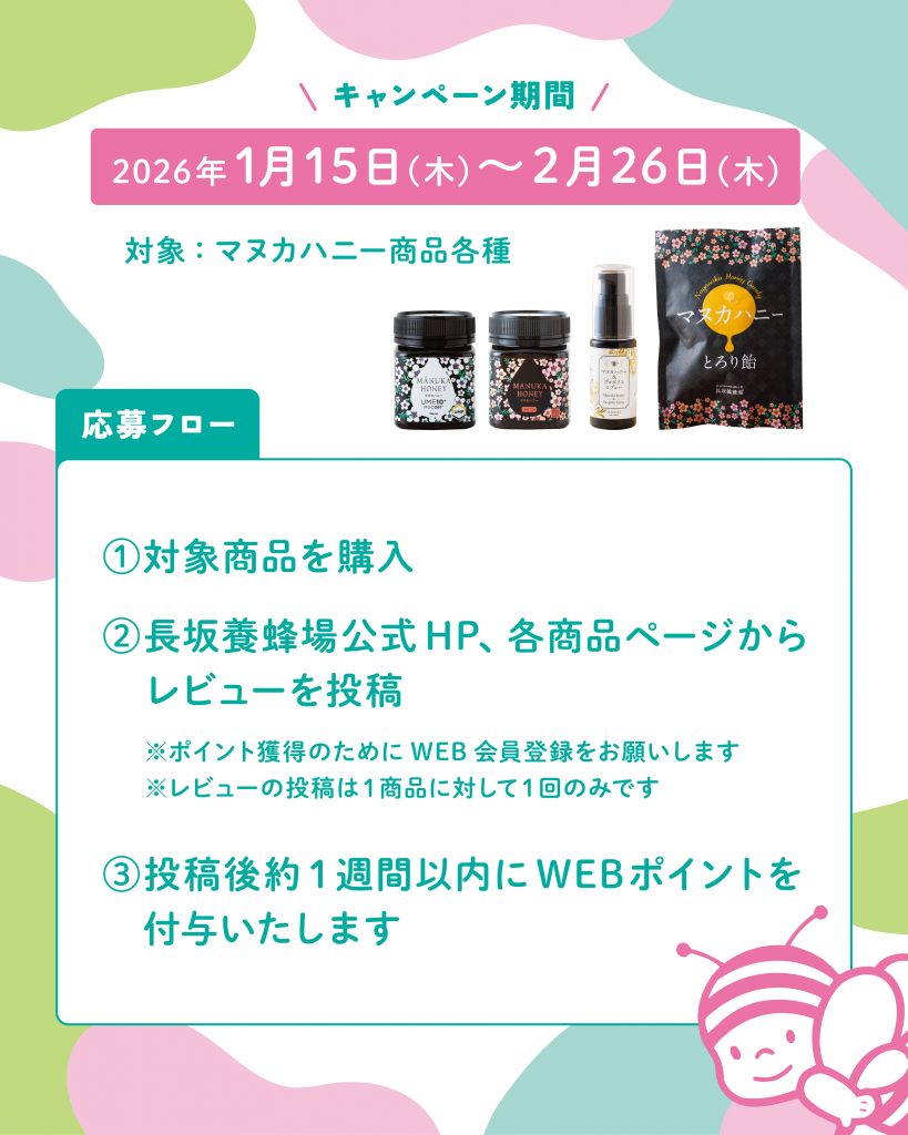 期間中にマヌカハニー商品についてのレビューをお寄せいただくと、WEBにて利用いただけるWEBポイント200pt(200円分)をプレゼントいたします!