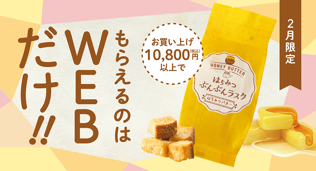 一会計、10,800円(税込)以上お買い上げの会員様に「はちみつぶんぶんラスク はちみつバター」のミニサイズを1個プレゼント!