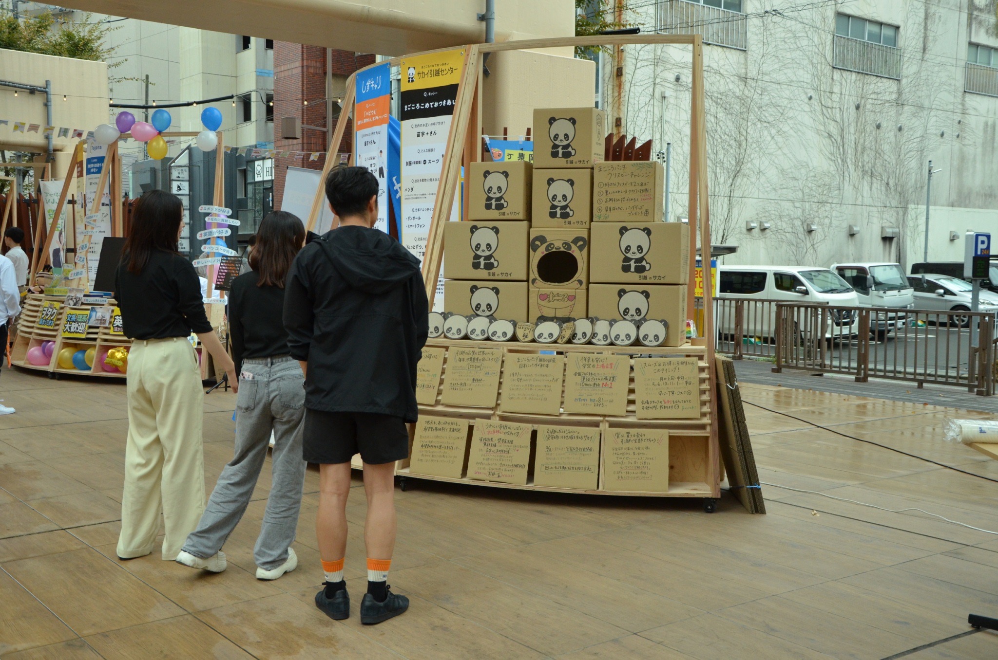 引越しのサカイさんは、サカイさんに関するクイズに答えられたらフリスビーを投げられるというゲーム。企業理解をしてもらいながらも楽しめると言う、素敵な企画でした!ちなみにフリスビーが的に入るともらえる景品は、カラフルなまごころパンダ靴下でした★