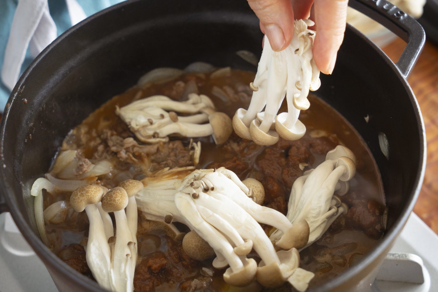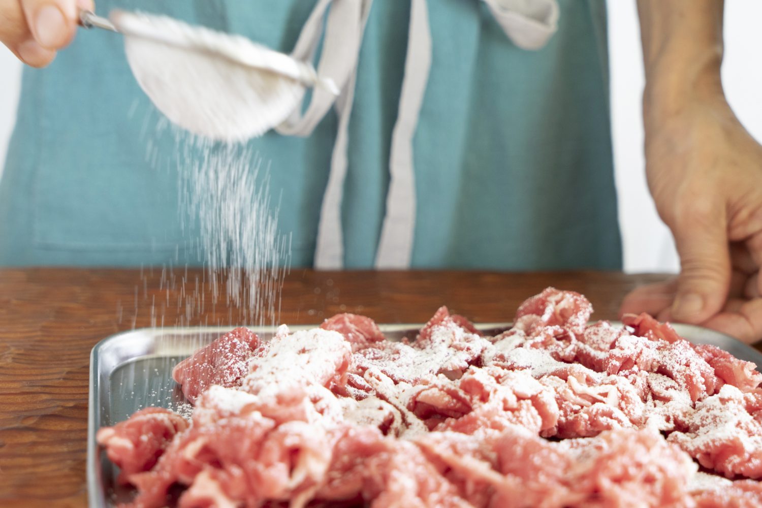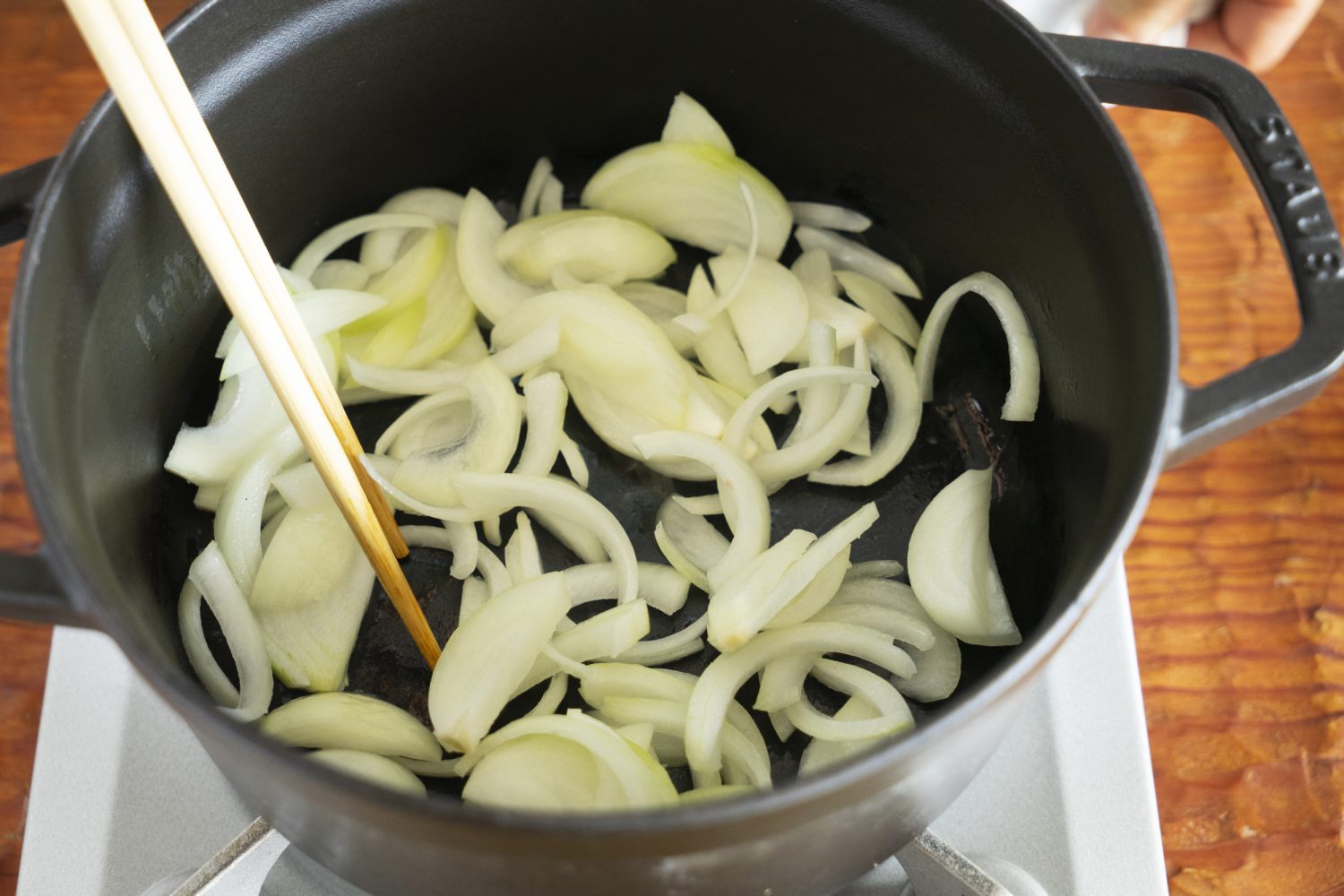 玉ねぎはざくざくとくし形切りにし、牛肉は食べやすい大きさに切り、塩、こしょうをふった牛肉は小麦粉をまぶします。小麦粉をまぶしておくと、食感が柔らかくなり、煮た時にほどよくとろみもつきます。