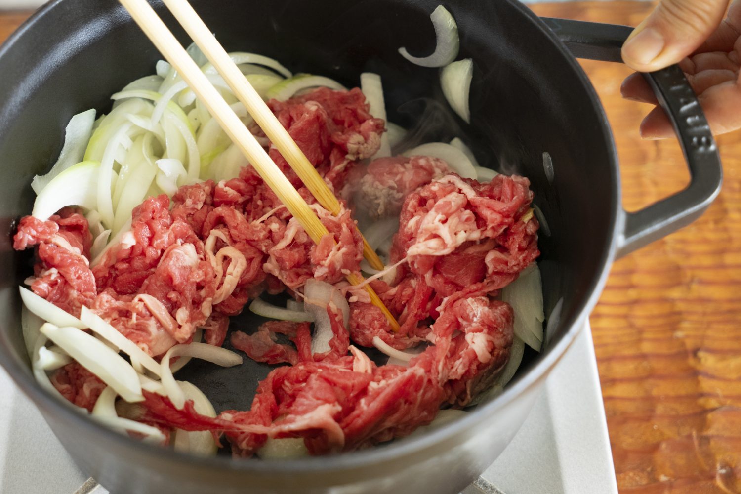 油を熱したら、玉ねぎ、牛肉の順に炒めます。