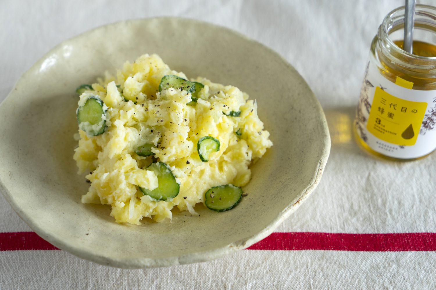 ハッシュドビーフを作る日に、うちでよく作るのがポテトサラダ。何ということもない一皿ですが、ポイントは「三代目の蜂蜜」と酢を入れること。「三代目の蜂蜜」入れることで何ともまろやかな口当たりになり、マヨネーズを減らして酢を入れることであっさりとした後味に。
