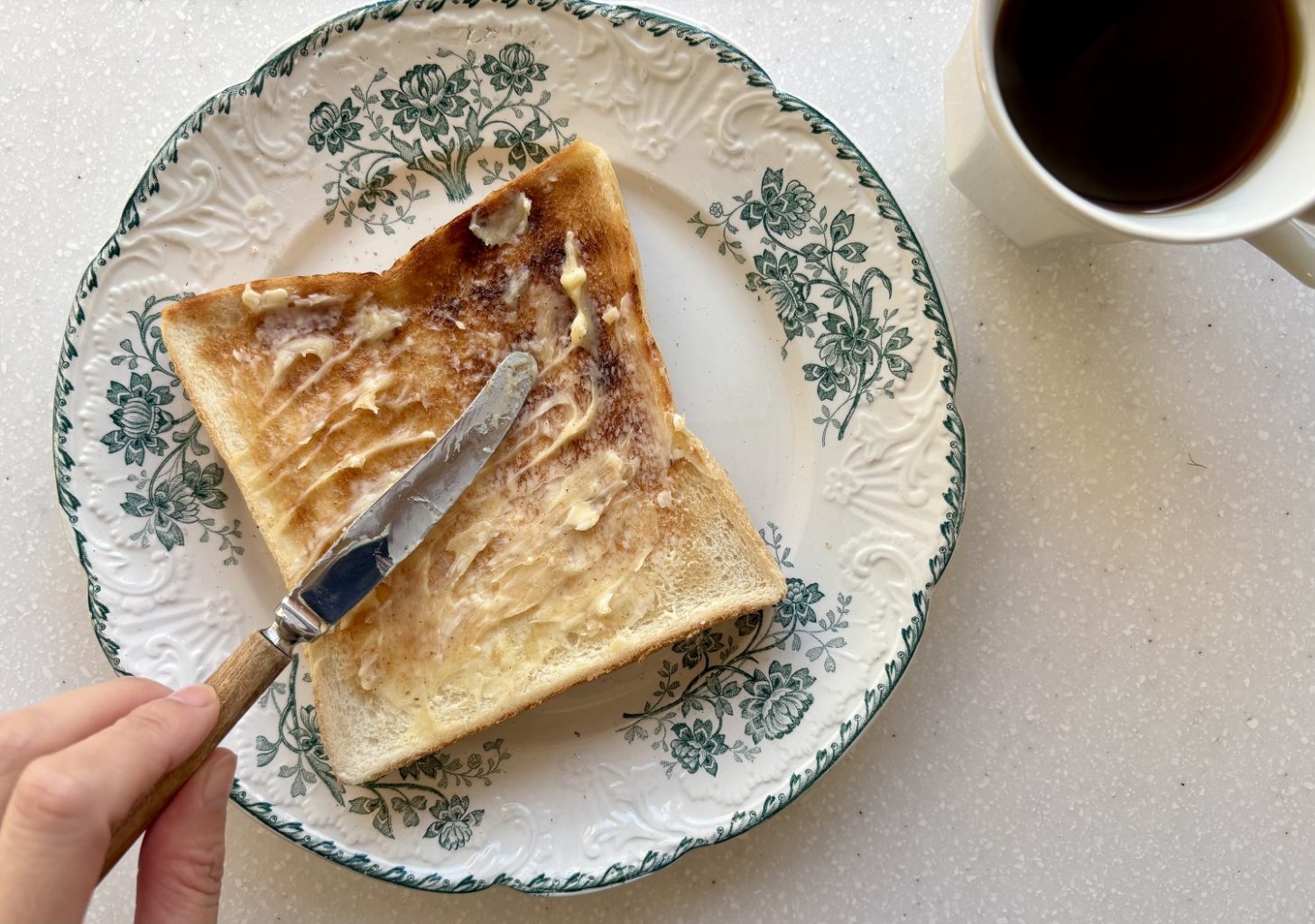澄んだ空気の朝の光の中で食べる、マヌカハニーのバタートーストは、私の冬の小さなごほうびです。