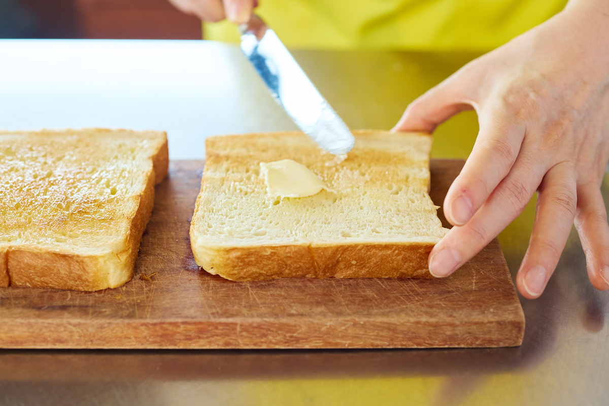 ①トーストした食パンにバターを片面ずつうすく全体に塗る。