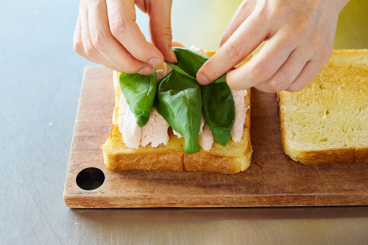 ④ ①のパン1枚に、サラダチキン、バジルの葉を並べ、はちみつ紅白なますの半分量をこんもり盛る。