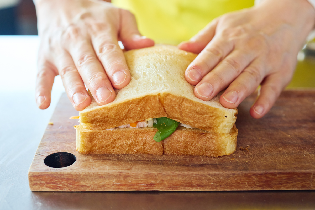 ⑦上から軽く押さえ、サンドしたサラダチキンやスモークサーモンが横向きになるよう2つに切る。