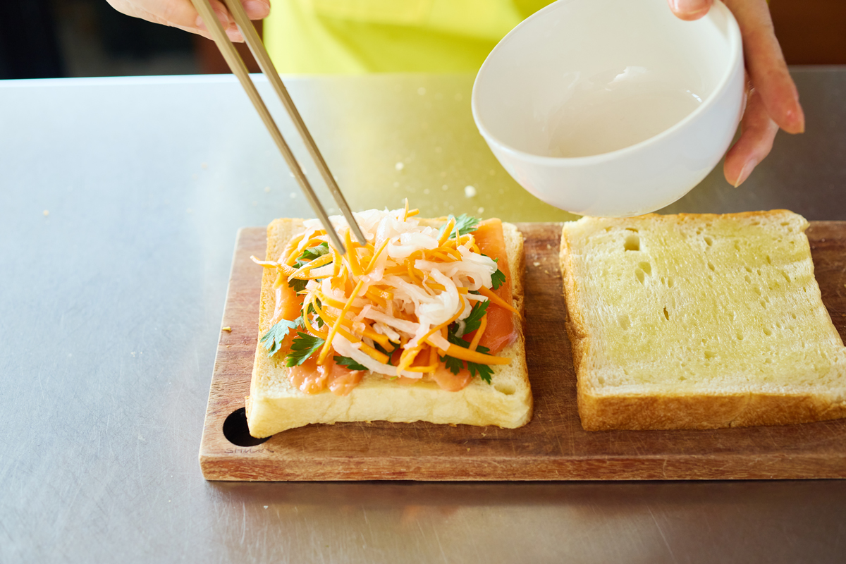 ⑤ ①のパン1枚に、スモークサーモン、イタリアンパセリまたはディルの葉を並べ、残りのはちみつ紅白なますをこんもり盛る。