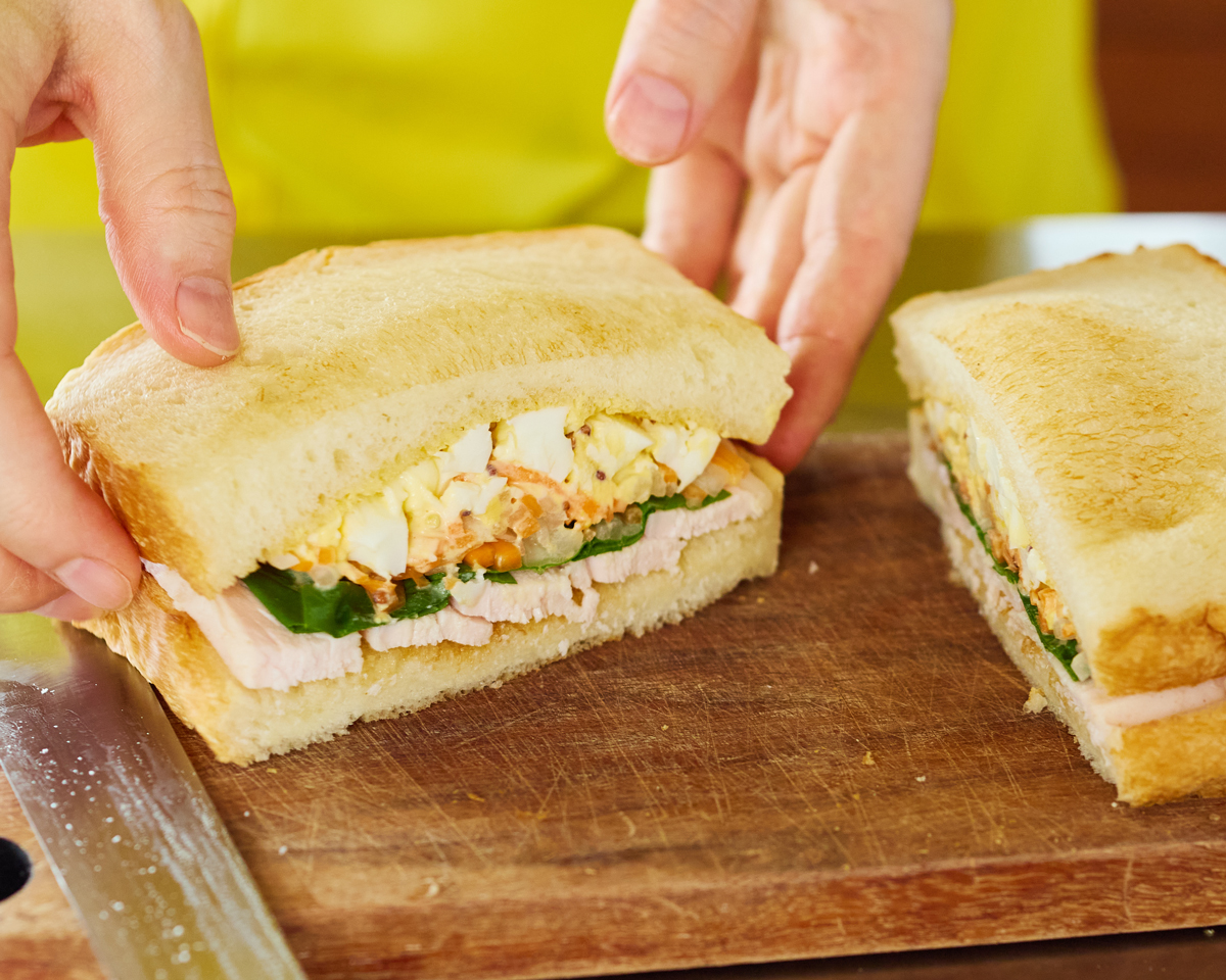⑥ ④・⑤のそれぞれに②の半分量を中央に乗せ、もう1枚の食パンのバターを塗った面を下にしてかぶせる。
