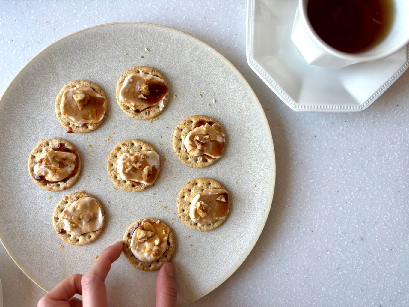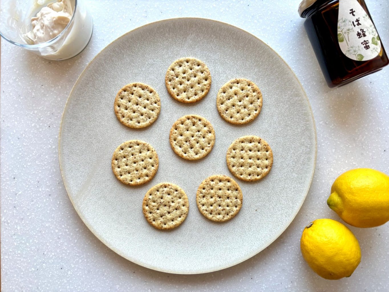 クラッカーとクリームチーズ、そして少しのそば蜂蜜とレモンを用意して、