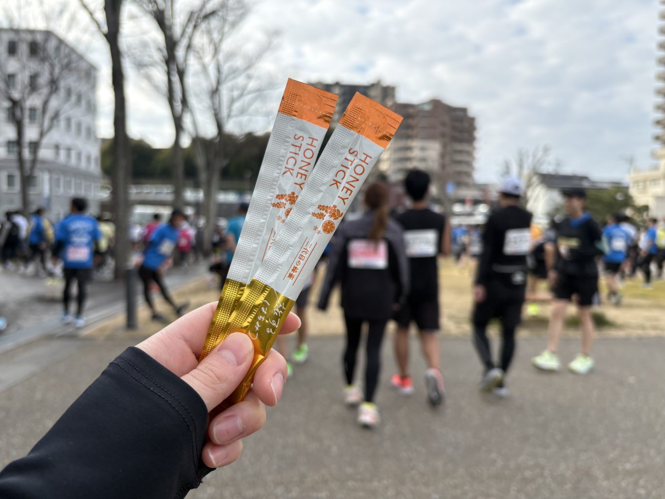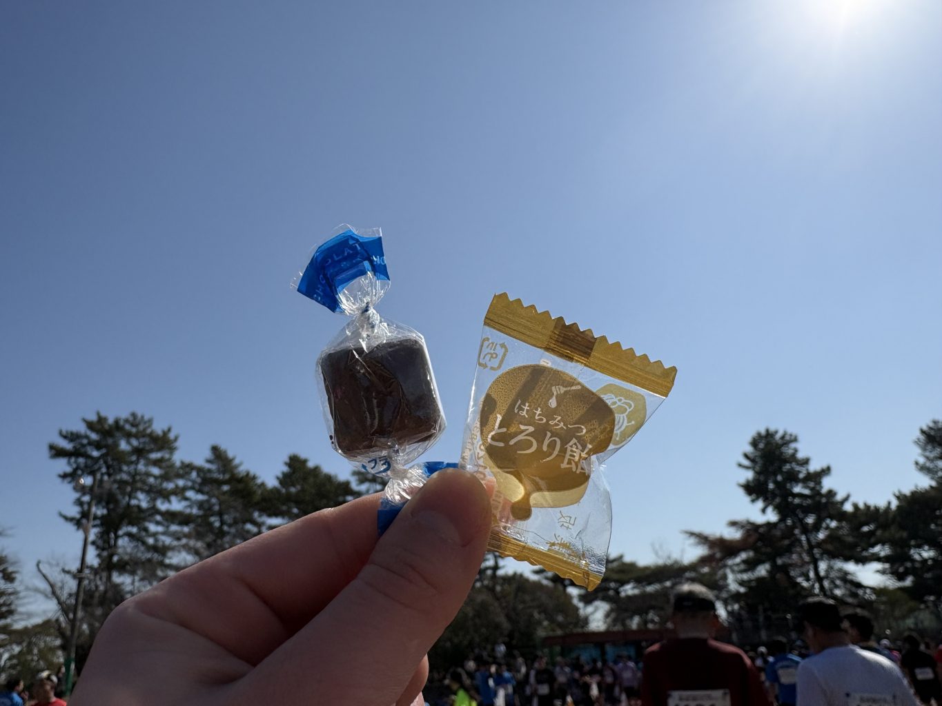 (↑こちらはゴール後にもらった、はちみつとろり飴と、沿道の応援の方がくれたチョコレート。ゴール後の体に染みわたりました。)