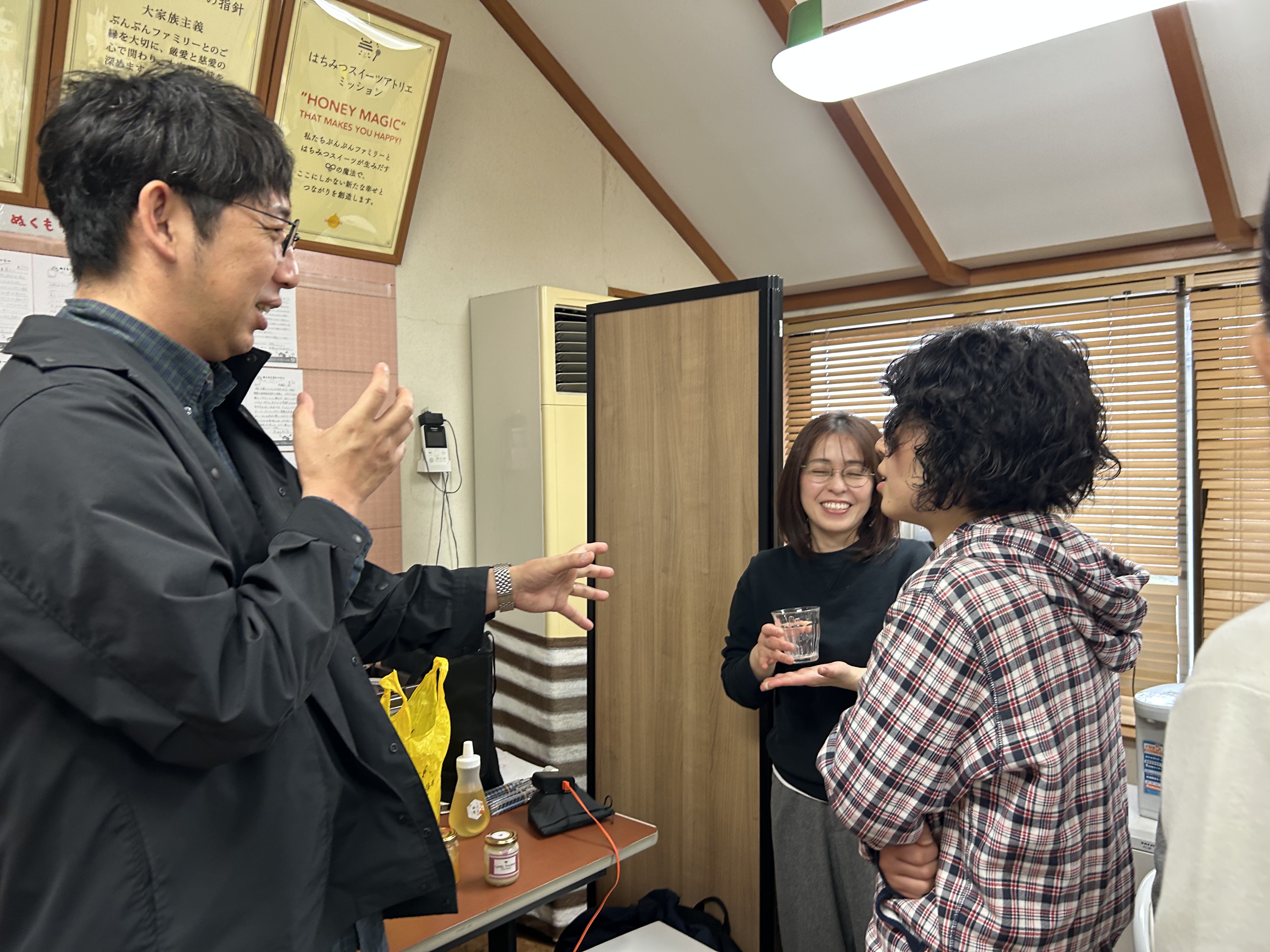 (ちなみに2枚目は、「おじさん同士ではちみつ注いじゃいますね(笑)」と周りを楽しませている長島さんと三輪さんです(笑))
