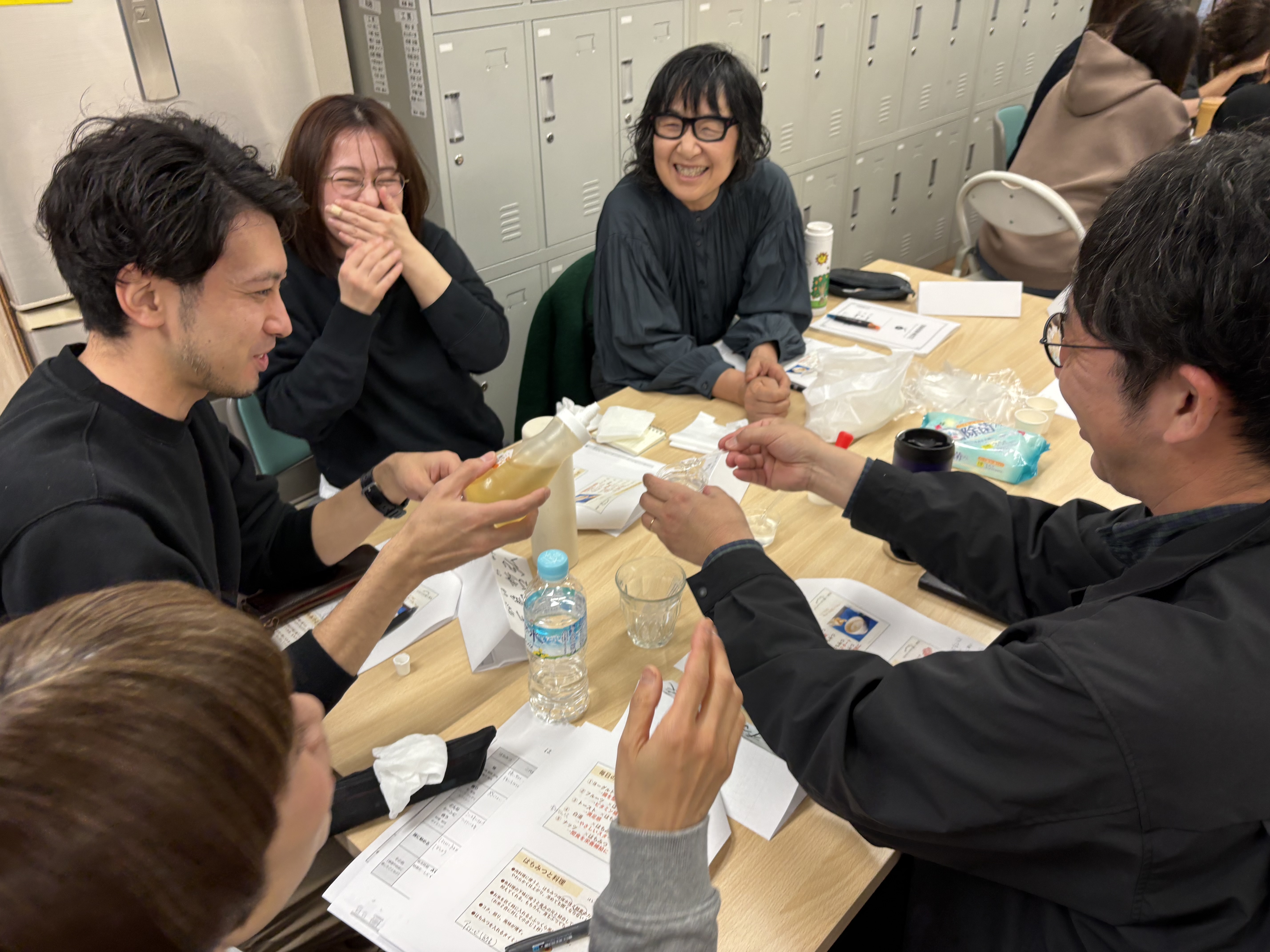 教室で座学はもちろん、体験や実験、テイスティングも数多くありました。上記の写真ははちみつをテイスティングしている様子。スタッフみんな本当に楽しそうでした♪
