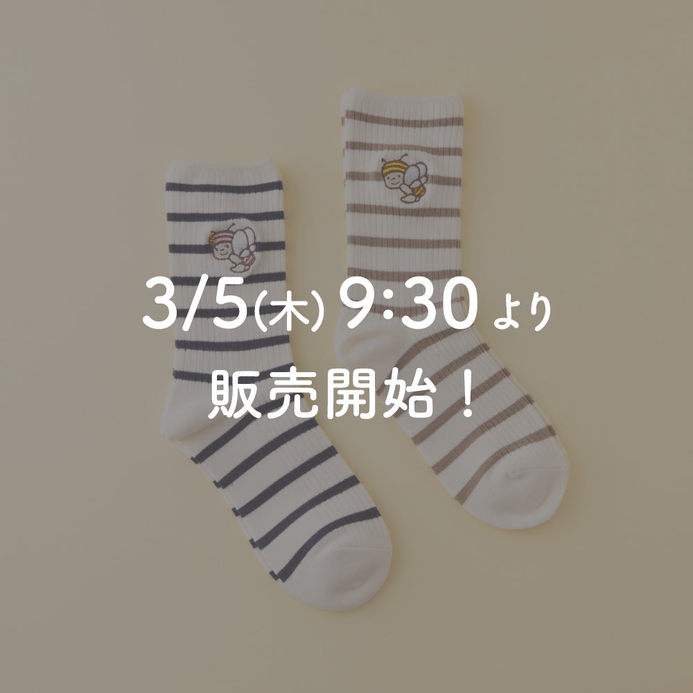 ミツバチをイメージしたボーダー柄のソックスです。ぶんぶんにはやさしい"モカチャ"を、るんるんにはおしゃれな"コン"をセレクト。いつものコーデに加えるだけで、どこか"ミツバチっぽい"アクセントになります。