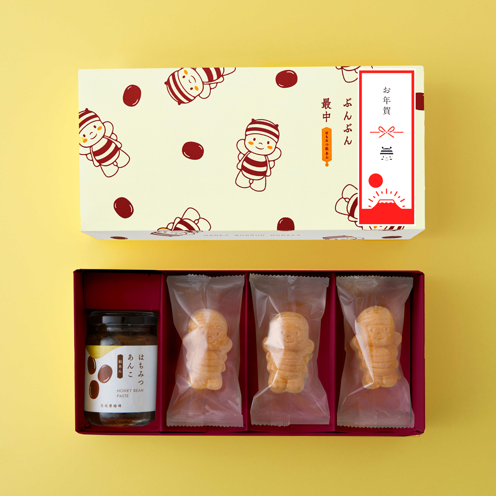 最中の皮は、マスコットキャラクター「ぶんぶん」型!ふたを開けた瞬間に笑顔がこぼれる、目にも美味しいお菓子です。
